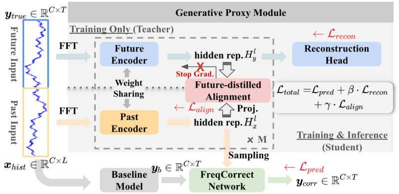 そこで私は、既存の予測モデルに後付け可能な、新しい生成的な周波数領域修正フレームワークを提案しました。本手法は、次の三つの協調的コンポーネントから構成されます。まず、任意の予測モデルをベースラインとして用い、安定したマクロトレンド(カルマンフィルタにおける「事前予測」に相当)を出力します。次に、「生成的代理モジュール」が、未来の情報を「教師」、過去の情報を「生徒」とみなす予測的変分オートエンコーダ(Predictive VAE)の枠組みにより、未来の周波数スペクトルの「あるべき姿」を潜在変数として推論します。これは、カルマンフィルタにおける高品質な「観測」をデータから動的に生成する試みです。最後に、「周波数領域修正ネットワーク」がカルマンフィルタの「修正」ステップに相当する役割を担い、ベースライン予測を、代理モジュールが推論した未来情報に基づいて精密に補正します。